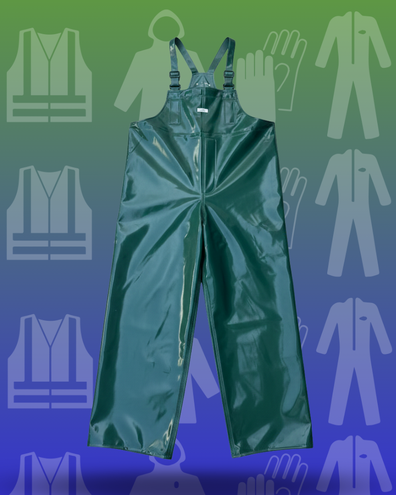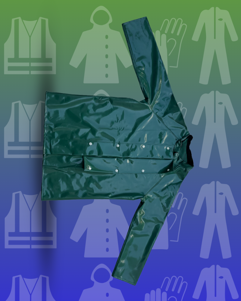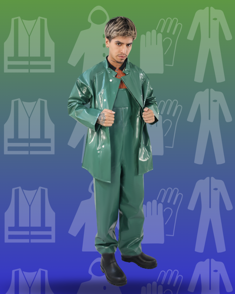 Overol PRO-ACID modelo PS-3 con cuello mao, diseñado para brindar protección corporal integral en ambientes industriales. Cuenta con pana en el cuello para evitar rozaduras, doble aletón con cierre y broches que ayuda a prevenir filtraciones y refuerzo en el tiro para mayor resistencia. Está fabricado en material tipo sándwich de doble capa de PVC con soporte intermedio de poliéster, calibre 19, en color verde olivo, ofreciendo resistencia a ácidos y durabilidad. Sus costuras selladas mediante alta frecuencia contribuyen a una mayor protección contra filtraciones.
